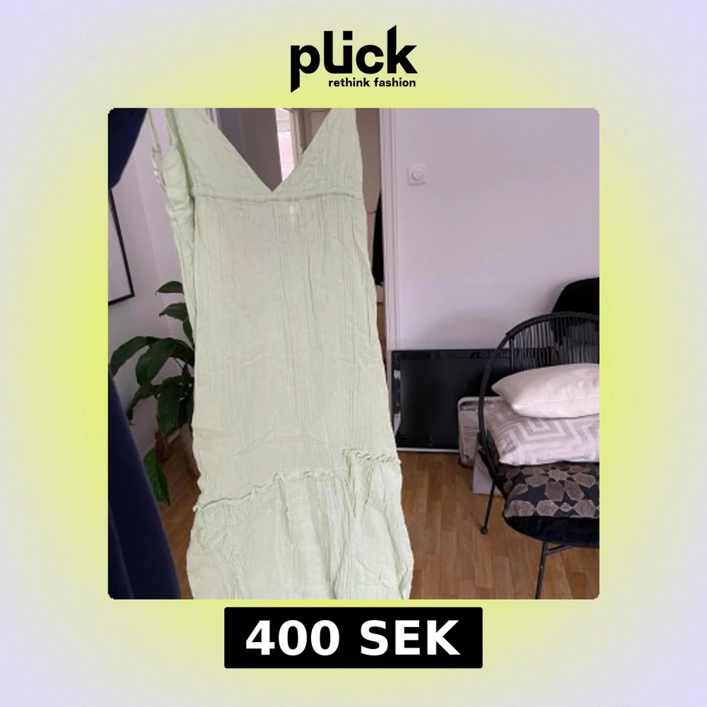 Säljer en ljusgrön långklänning med smala justerbara axelband och öppen rygg med knytning. Perfekt för varma sommardagar.