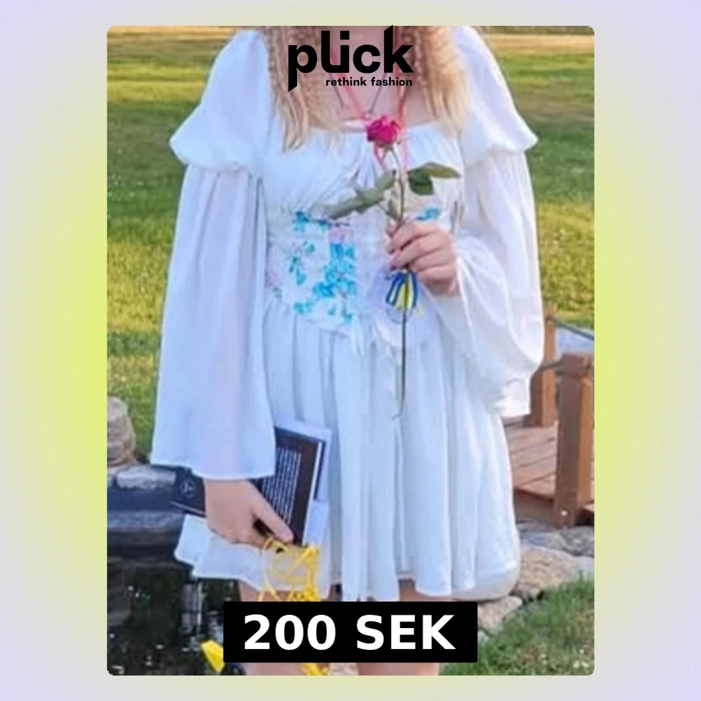 Säljer en vit kortklänning med puffiga långärmar och ett blommigt liv i blå och rosa toner. Klänningen har snörning framtill och en romantisk, omlottliknande design. Perfekt för sommarens alla tillfällen och ger en riktigt drömmig vibe.