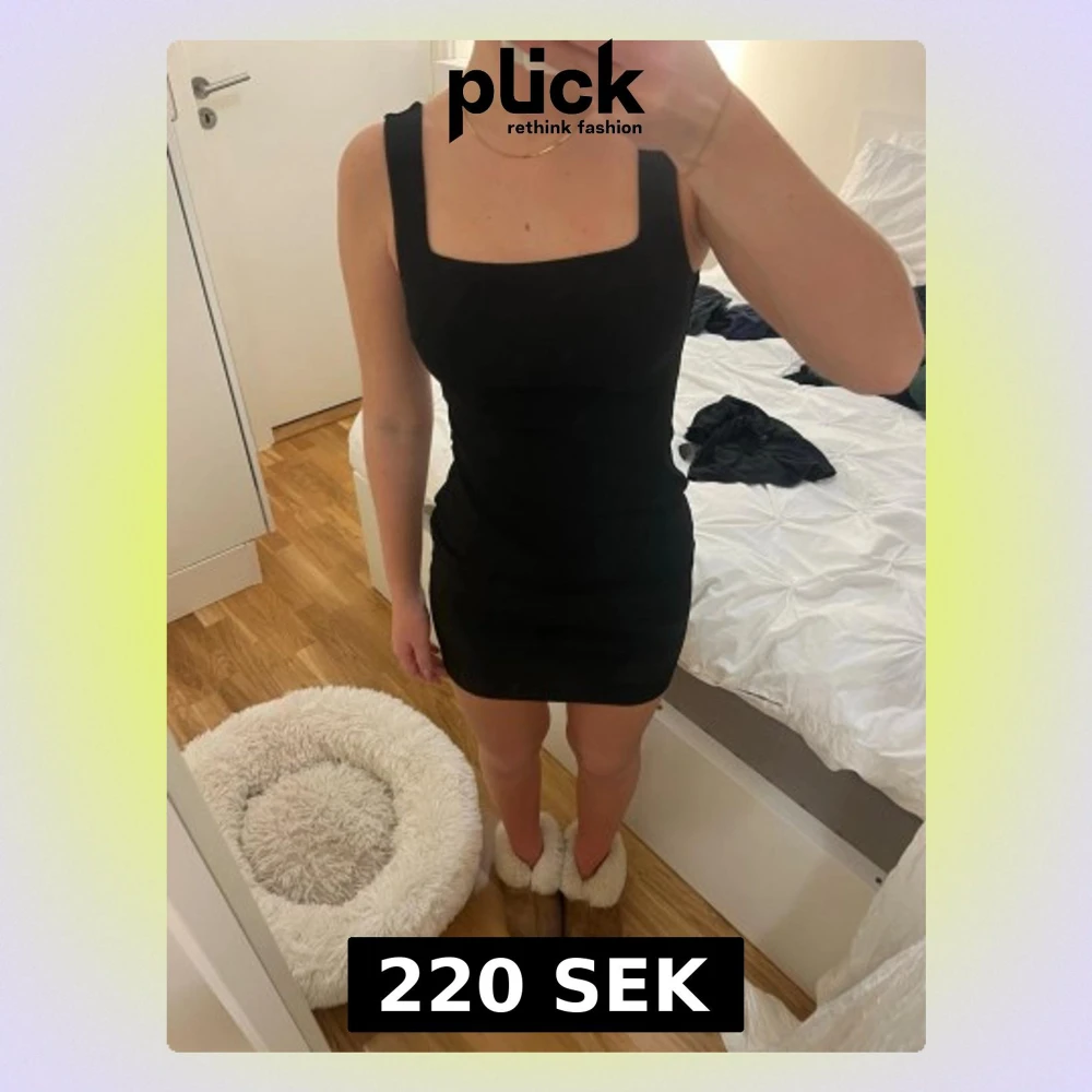 En svart, tight kortklänning med breda axelband och fyrkantig urringning. Klänningen har en enkel och stilren design som framhäver figuren. Perfekt för dig som gillar minimalistisk stil.