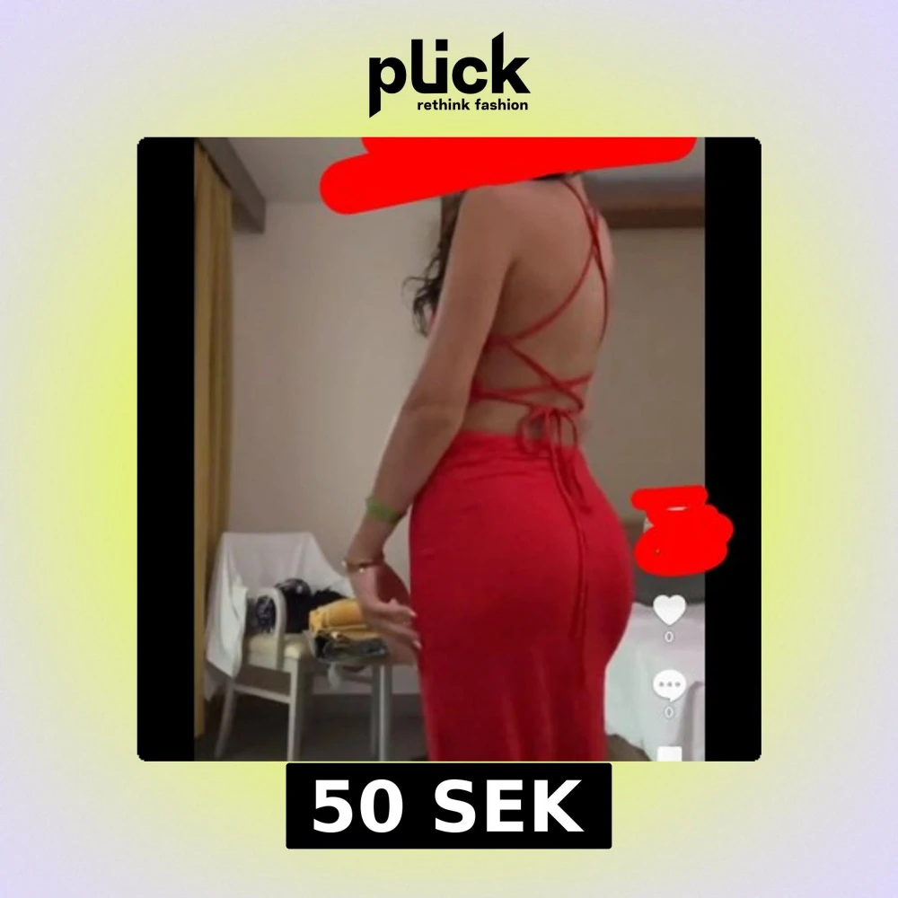 Snygg röd klänning med öppen rygg och snörning. Klänningen har en tight passform och är perfekt för en kväll ute. Den är axelbandslös och har en elegant design som framhäver figuren. Storlek s men funkar som xs