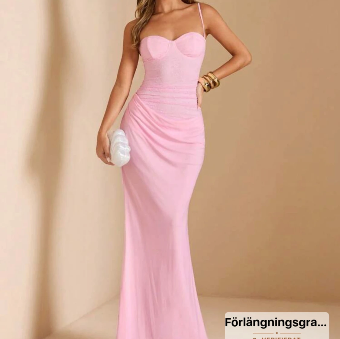 Supersnygg ljusrosa långklänning med figurnära passform och smala axelband. Klänningen har en markerad byst och lätt drapering över höfterna för en elegant siluett. Perfekt för dig som vill sticka ut med en feminin och stilren look.