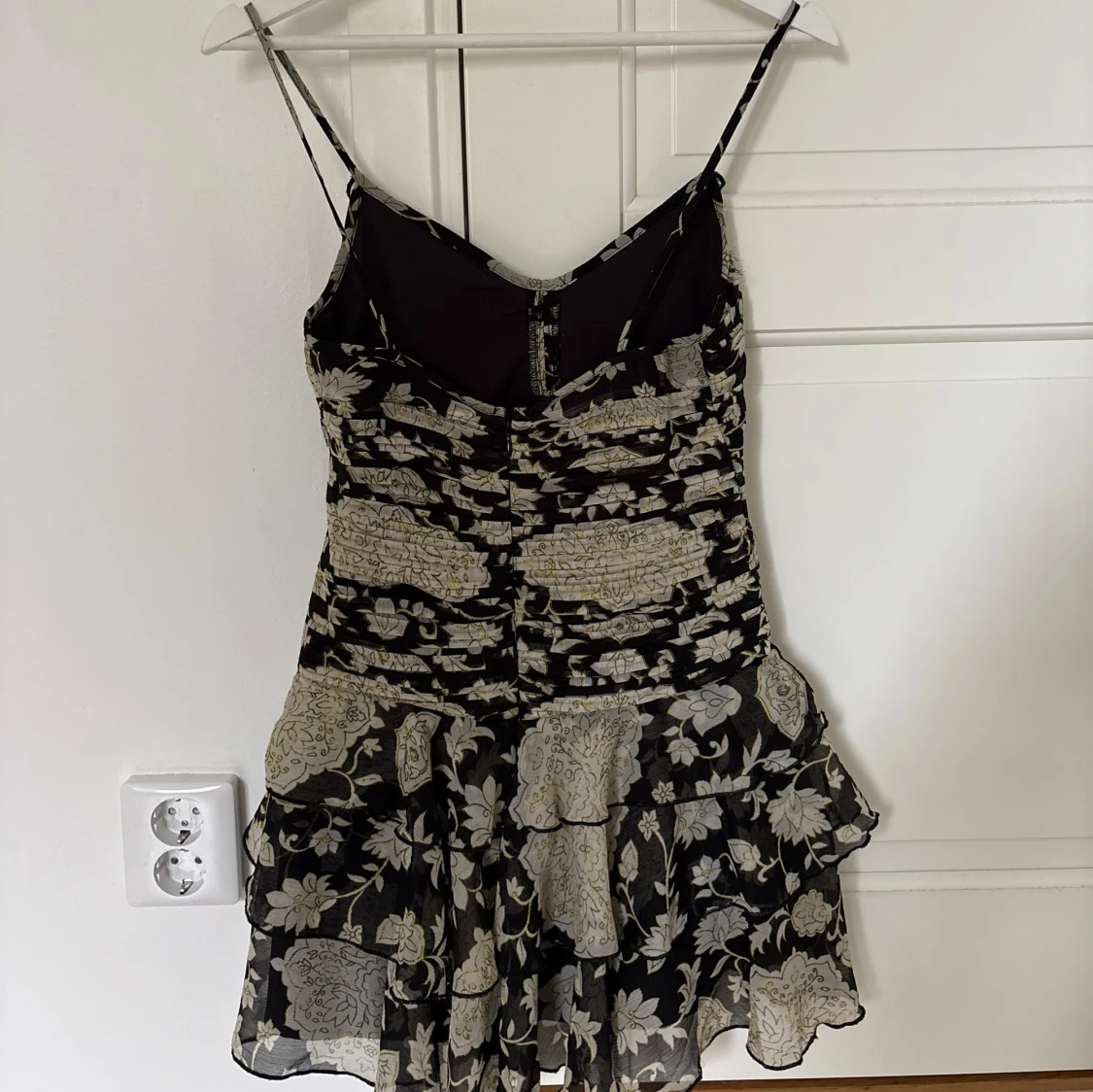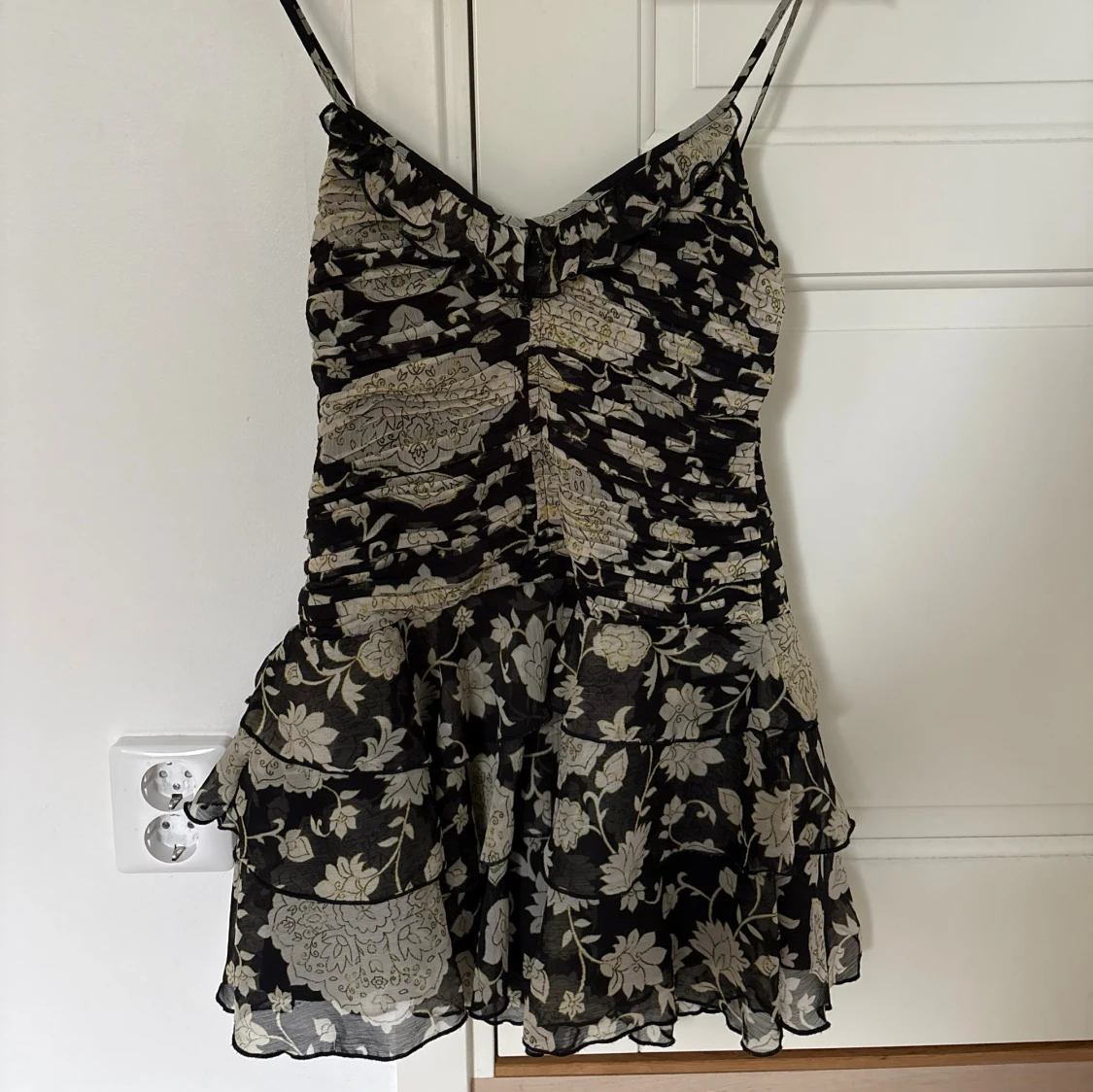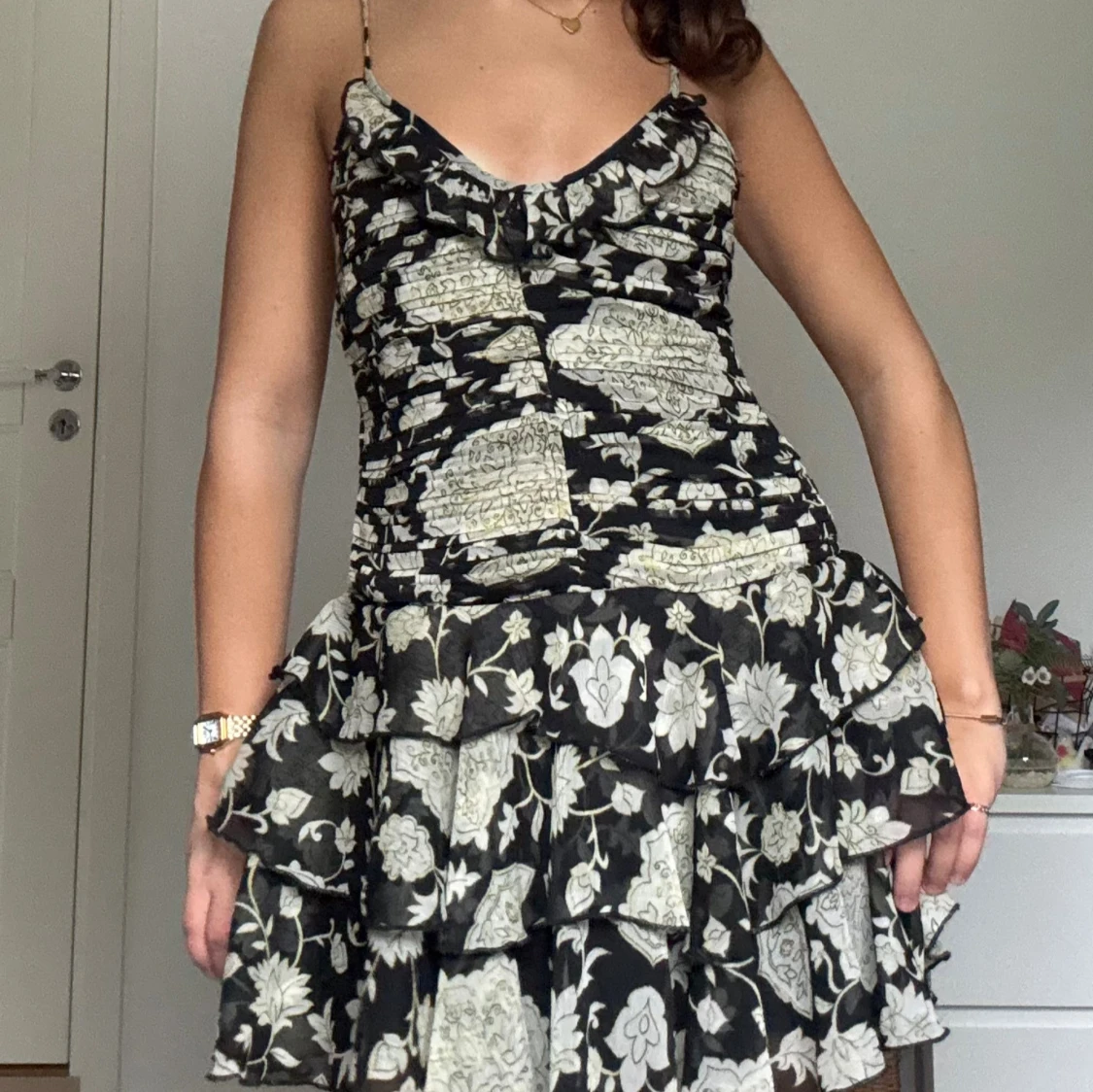 Supersöt kort klänning med svart botten och ljusa blommor, tunna axelband och flera volanger i kjolen.