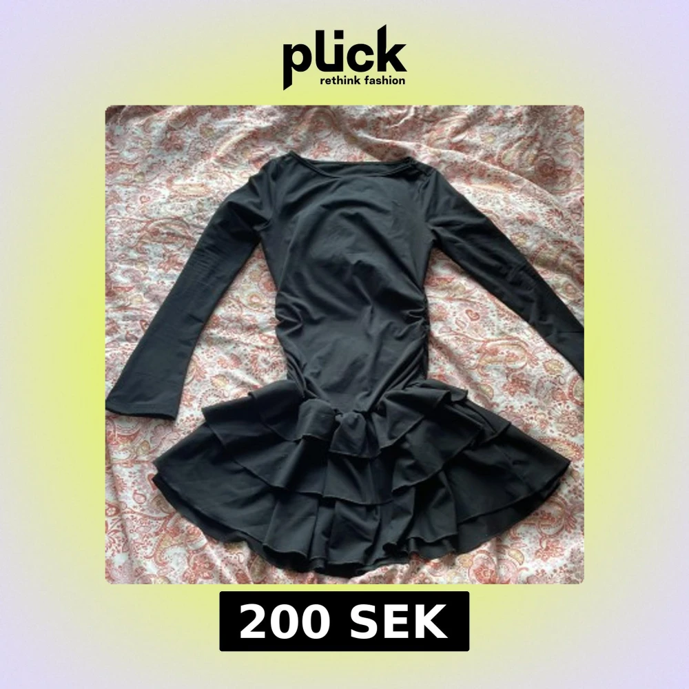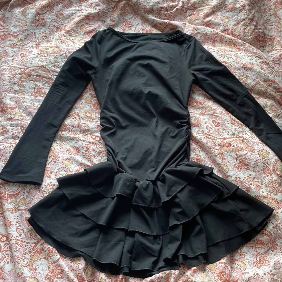Supersnygg svart klänning med långa ärmar och flera volanger i kjolen. Tight passform upptill och markerad midja ger en riktigt cool siluett. Perfekt för dig som vill sticka ut med en unik look!