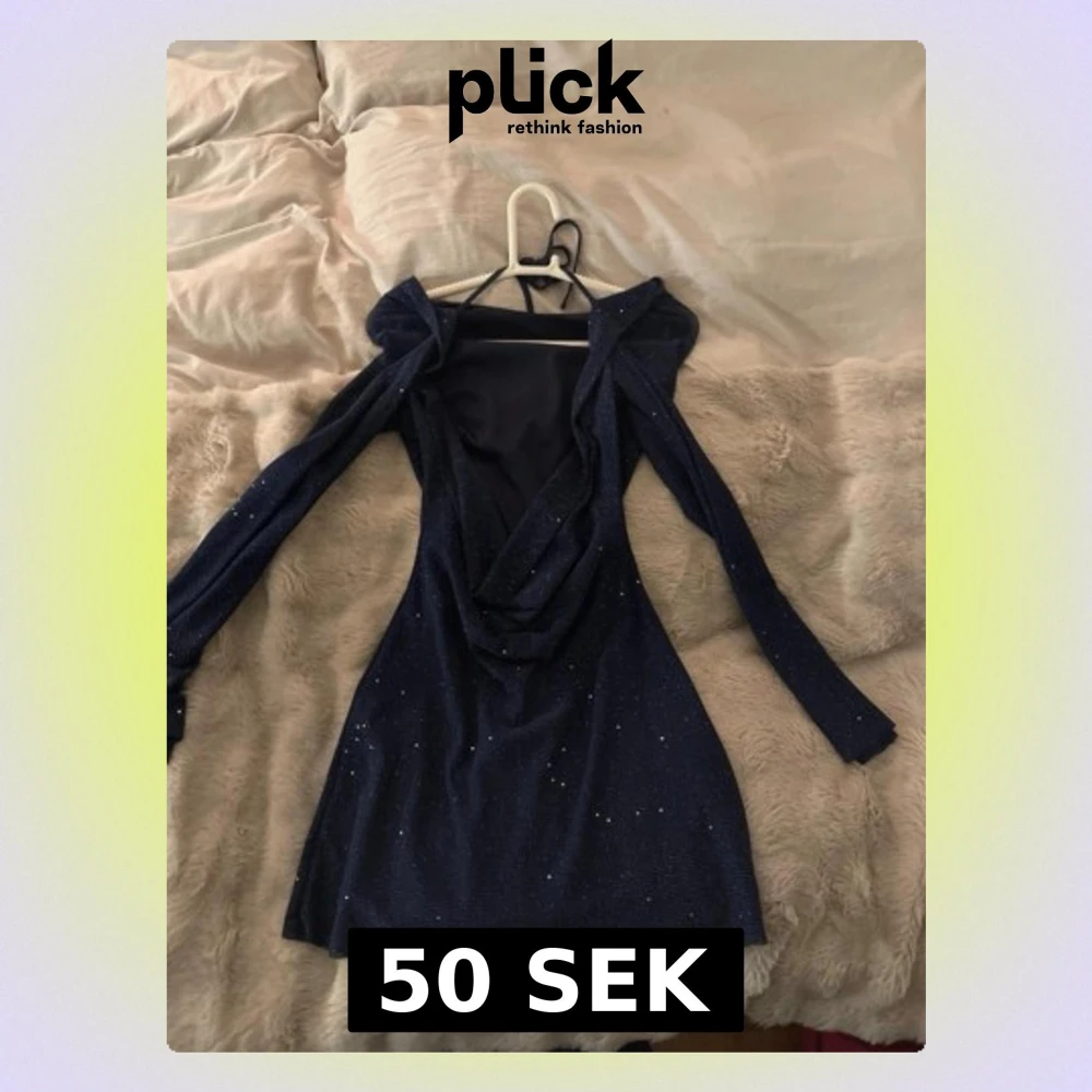 Säljer en snygg marinblå kortklänning med glittriga detaljer. Klänningen har långärmade ärmar och en draperad omlottfront som ger en cool look. Materialet är mjukt och stretchigt, perfekt för att sticka ut. Passformen är tight och klänningen har en elegant v-ringning.