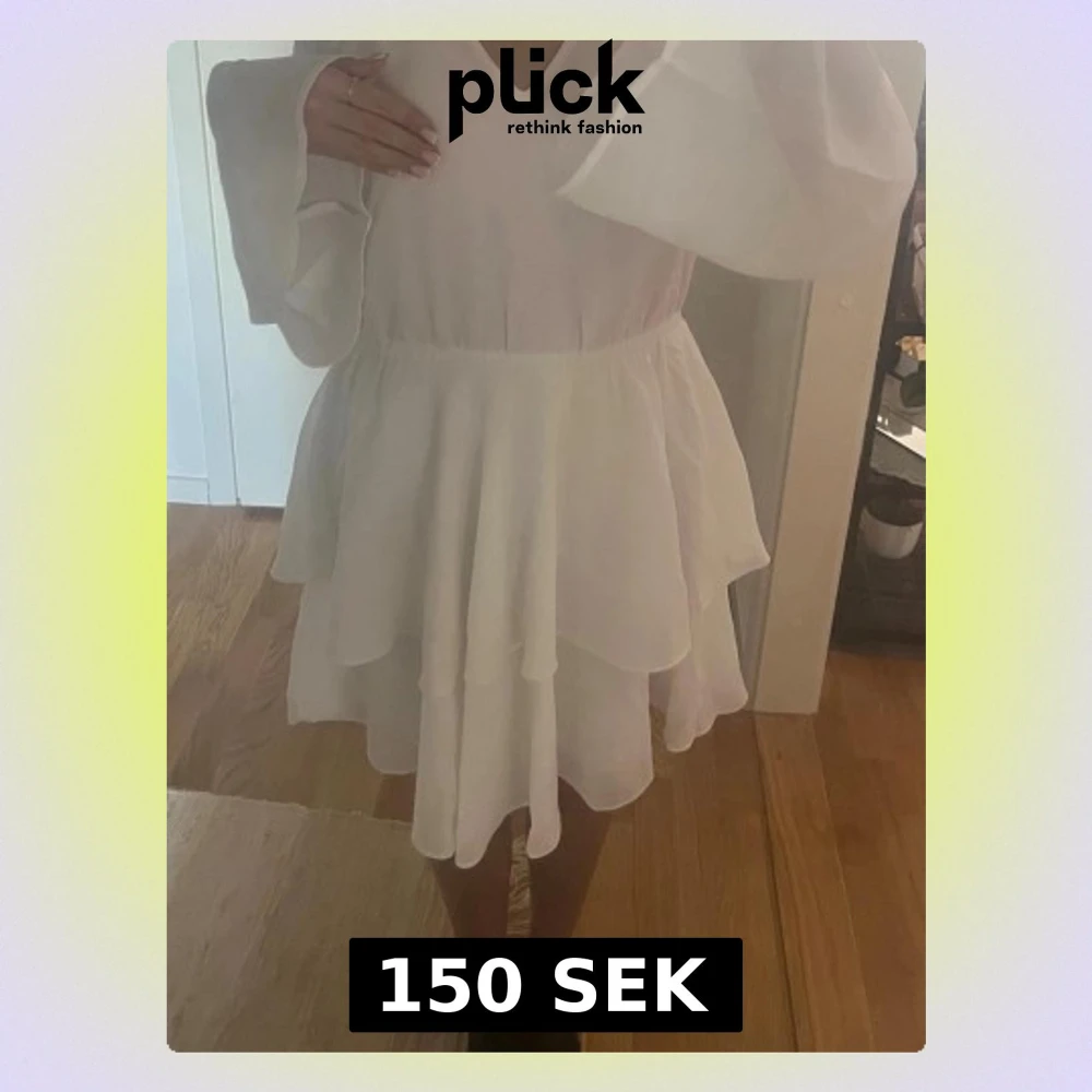 Superfin vit klänning med v-ringning och långa vida ärmar. Kjolen har flera lager volanger som ger en flowy känsla. Perfekt för dig som gillar en romantisk och luftig stil.