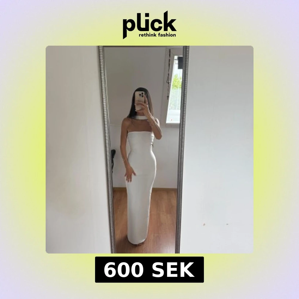 Supersnygg vit långklänning med axelbandslös design och hög slits bak. Klänningen har en tight passform och en stilren choker-detalj runt halsen. Perfekt för dig som vill sticka ut med en minimalistisk och elegant look. Använd en gång