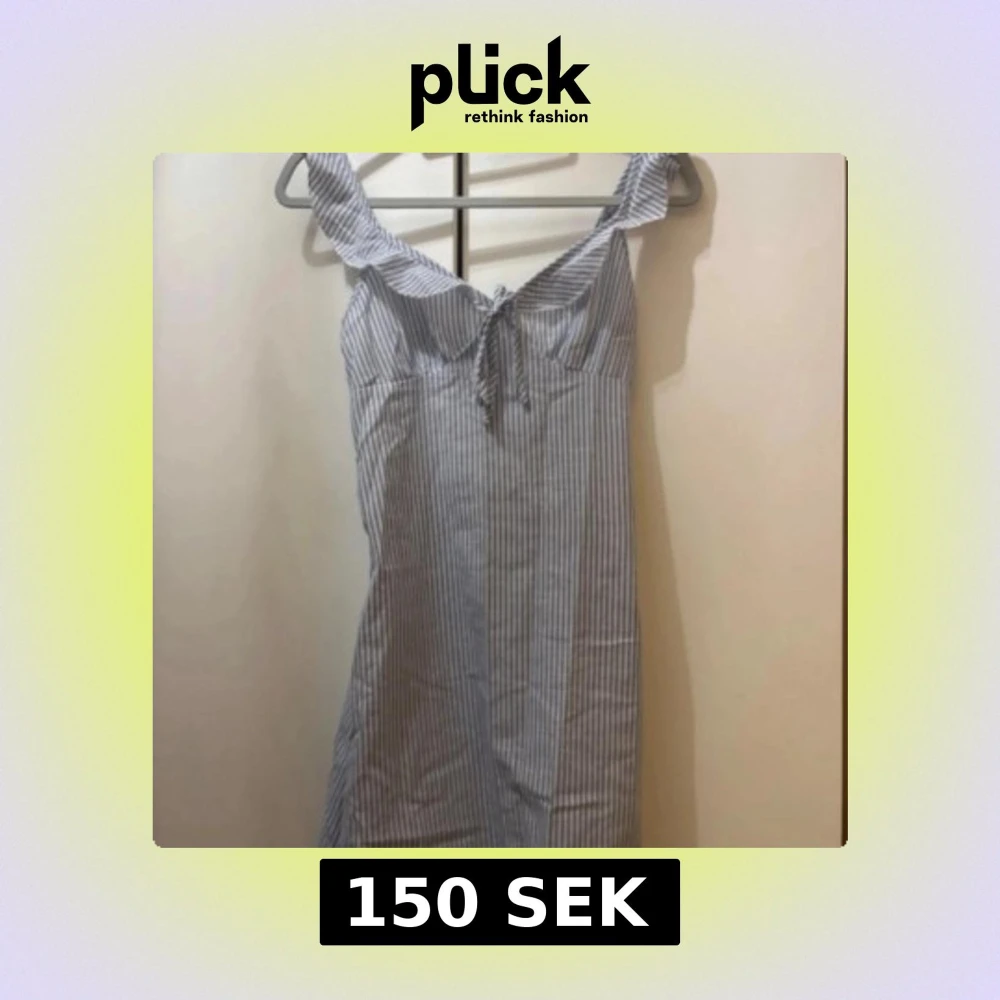 Säljer en söt kortklänning med blåvita ränder och knyt framtill. Klänningen har axelbandslös design och är perfekt för varma dagar. Materialet känns lätt och luftigt, och den har en feminin passform som framhäver figuren.
