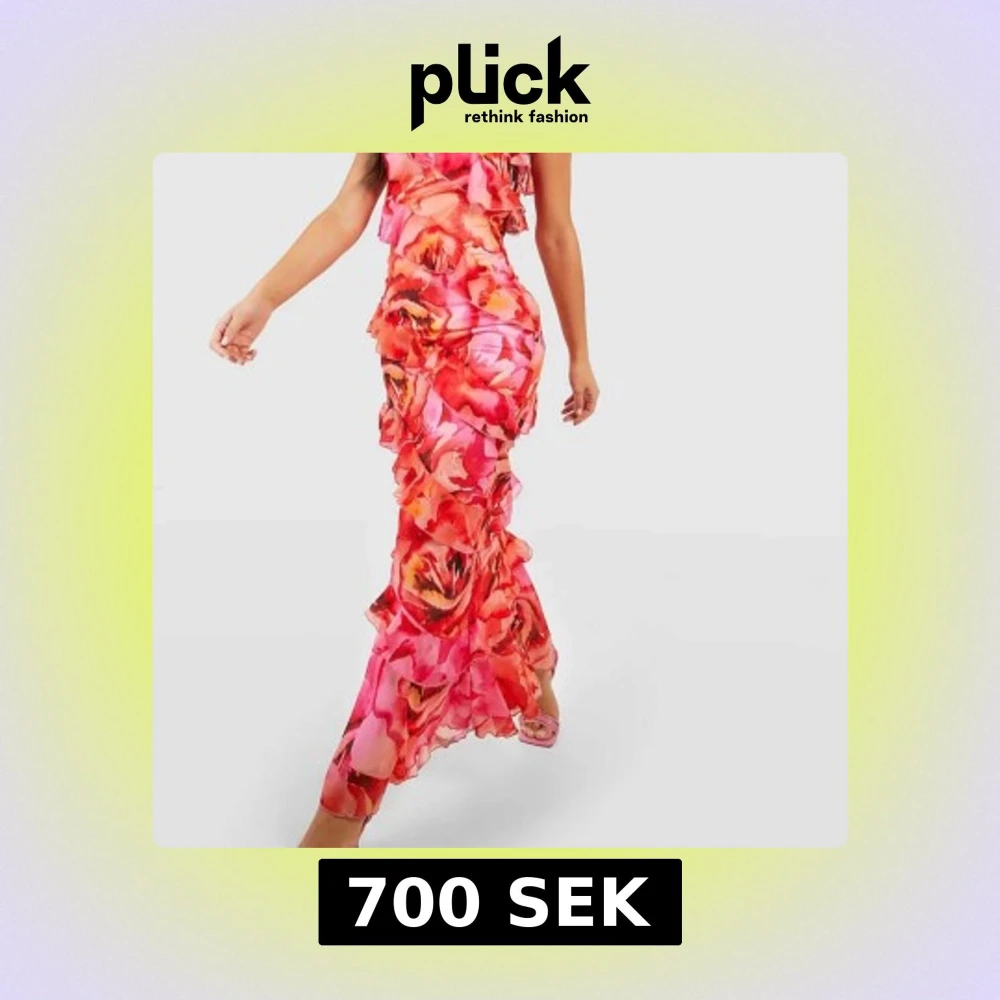 Säljer en färgglad långklänning med ett blommigt mönster i rosa och orange toner. Klänningen har en one-shoulder design med volanger som ger en romantisk känsla. Perfekt för sommarens fester! Oanvänd! Pris lapp kvar