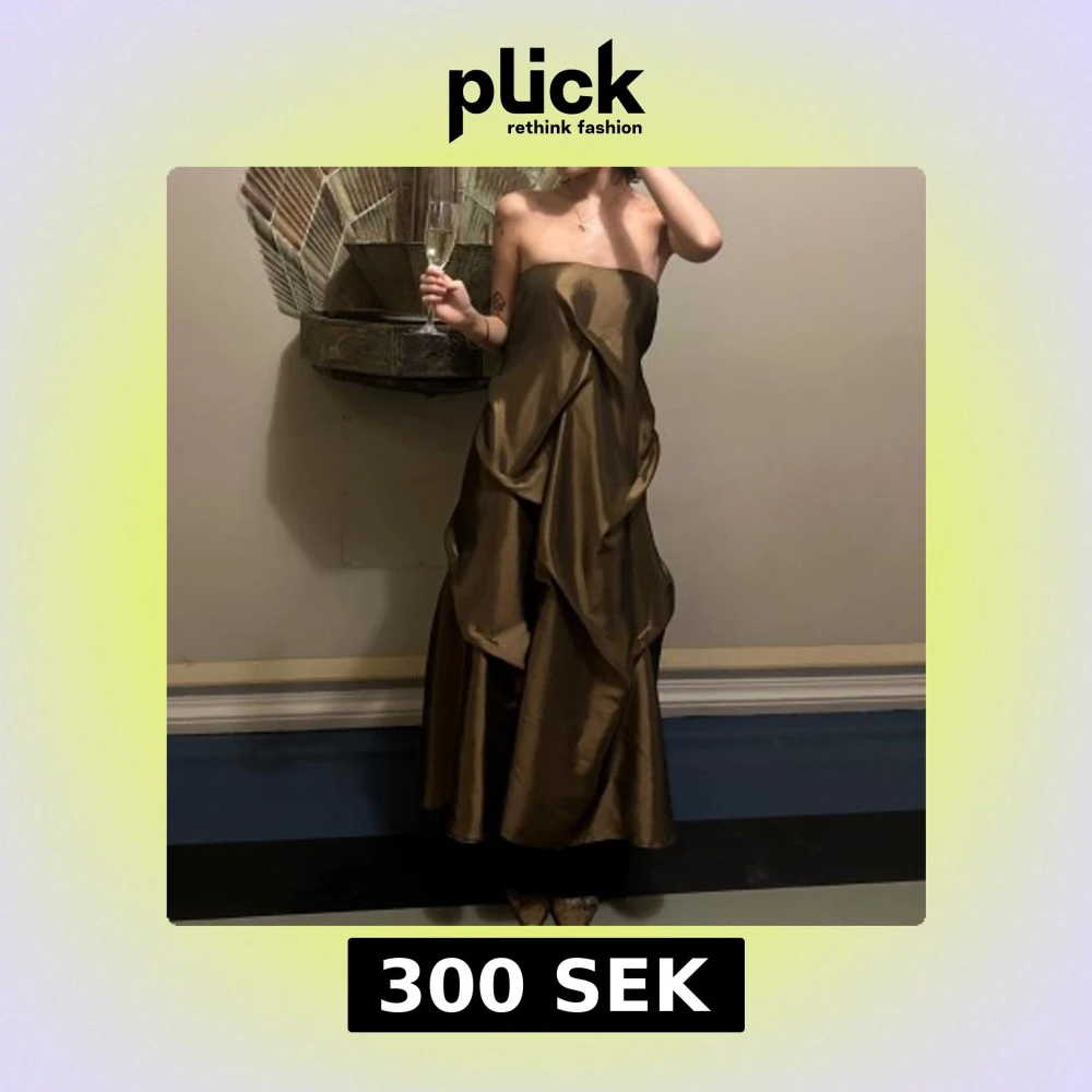 Elegant brun axelbandslös klänning med draperad design. Perfekt för festliga tillfällen. Kan bäras som långkjol med släp eller klänning !!