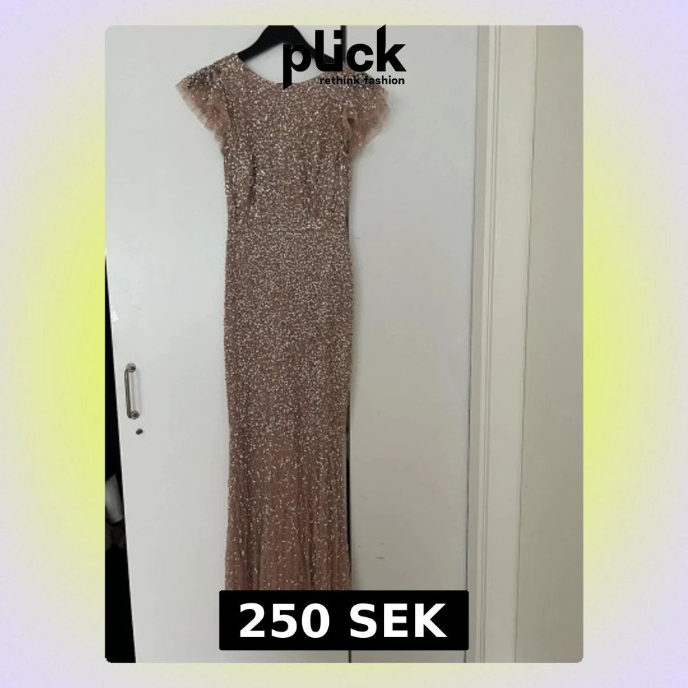 Säljer en elegant långklänning i champagnefärg med glittriga paljetter över hela klänningen. Klänningen har korta volangärmar, rund halsringning fram och djup v-ringning i ryggen. Materialet är troligtvis polyester och klänningen har en figurnära passform.