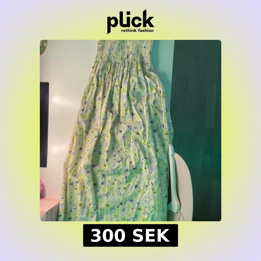 Supersöt långklänning i ljusgrönt med blommigt mönster. Smockad upptill och utsvängd kjol som ger en flowy känsla. Perfekt för varma dagar och somriga vibes. Klänningen är ärmlös och har en romantisk look.