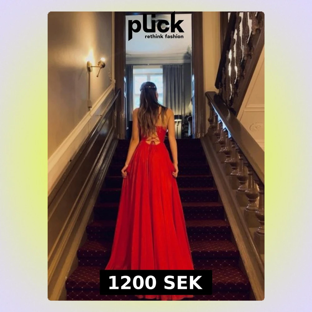 Säljer en röd långklänning med smala axelband, v-ringning och hög slits på sidan. Klänningen har öppen rygg med snygg snörning och faller elegant i ett svepande tyg. Perfekt för bal eller student. Bra kvalitet, hel & fin. Köpt för nypris för 3000