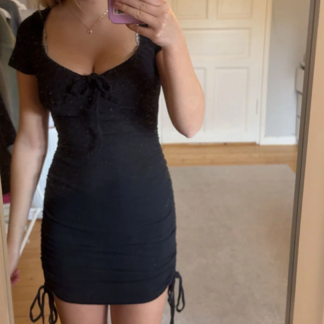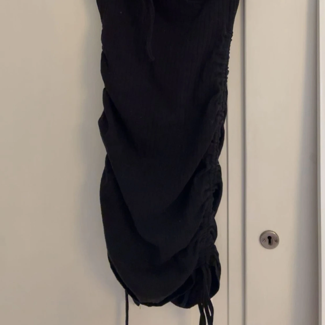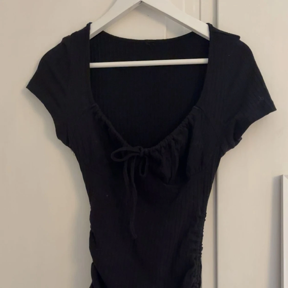 Supersnygg svart kort klänning med ribbad struktur, v-ringning och knyt framtill. Klänningen har korta ärmar och snörning i sidorna som ger en tight och smickrande passform. Perfekt för dig som gillar en enkel men trendig look.