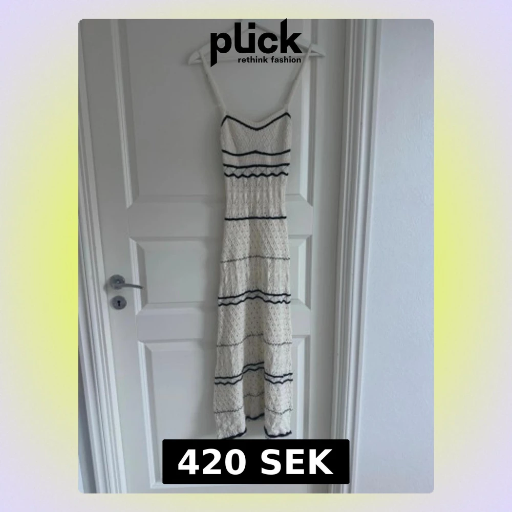 Supersnygg långklänning i vit stickad bomull med svarta vågiga ränder och tunna axelband. Klänningen har ett unikt mönster i stickningen och sitter figurnära. Perfekt för sommarens alla tillfällen!