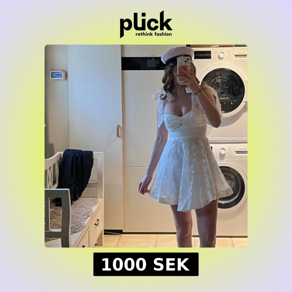 Säljer en söt vit kort klänning med spetsdetaljer och rosett vid axlarna. Klänningen har en omlottliknande överdel, markerad midja och lätt utställd kjol. Perfekt för student eller sommarens festligheter. Supersnygg och feminin look!