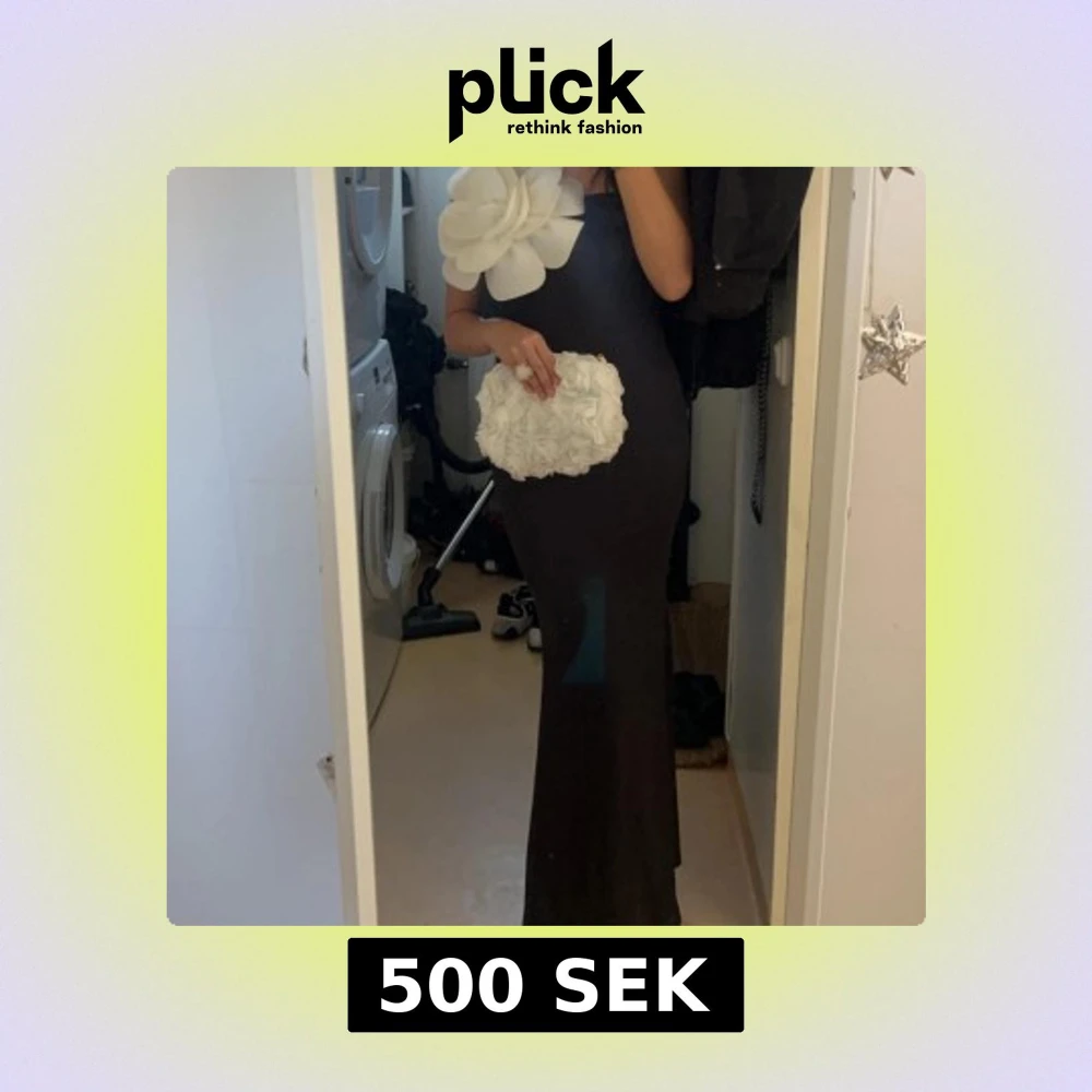 Säljer en svart långklänning med figurnära passform och stora vita blommor som dekoration vid axel och midja. Klänningen har ärmlös design och en elegant siluett som verkligen sticker ut.
