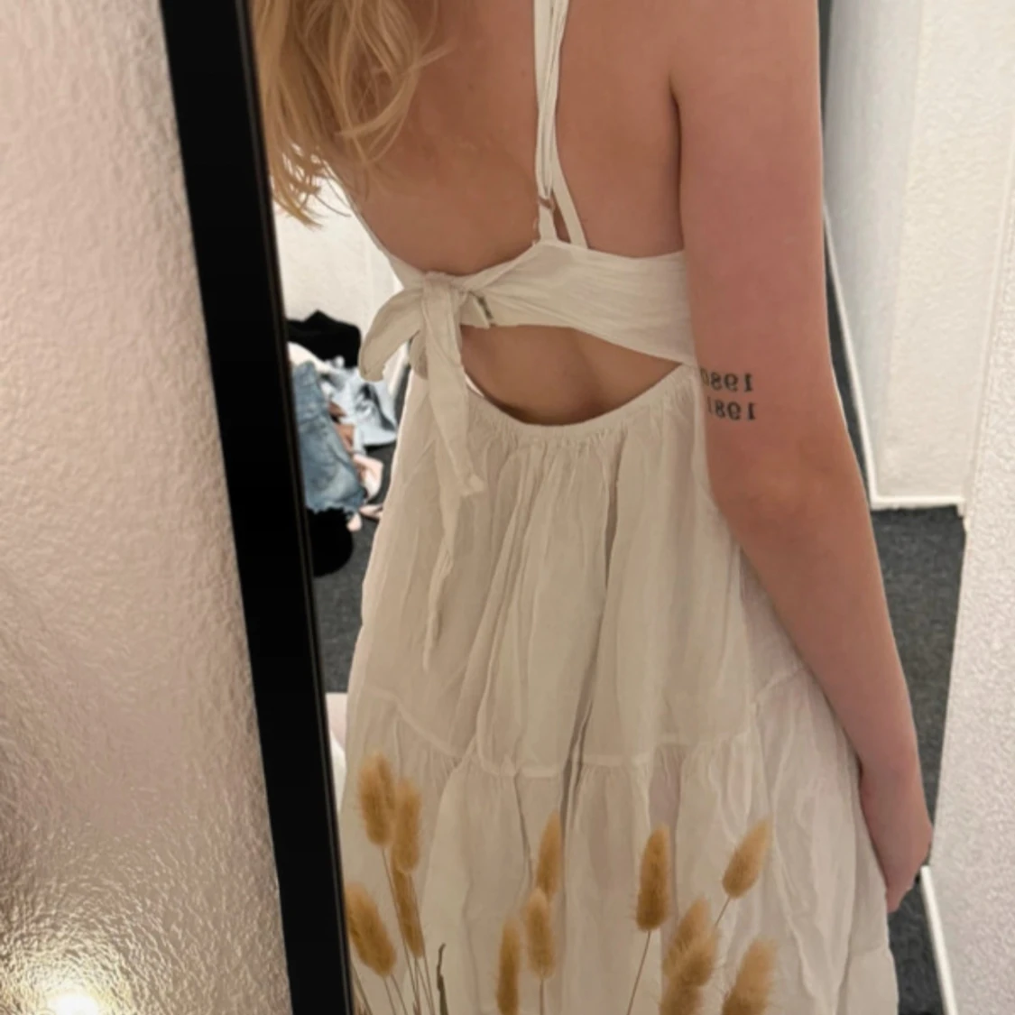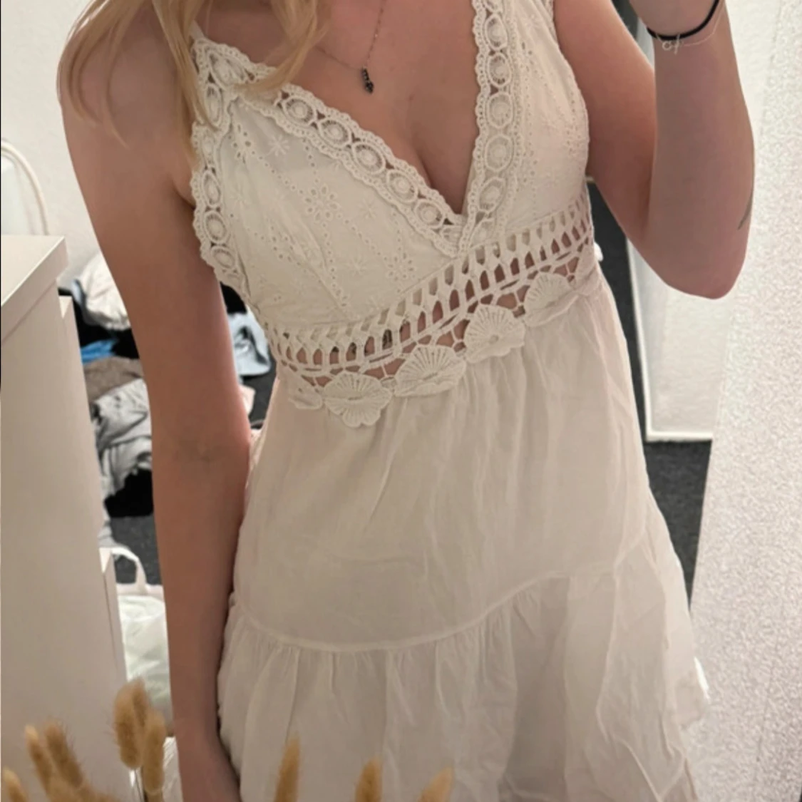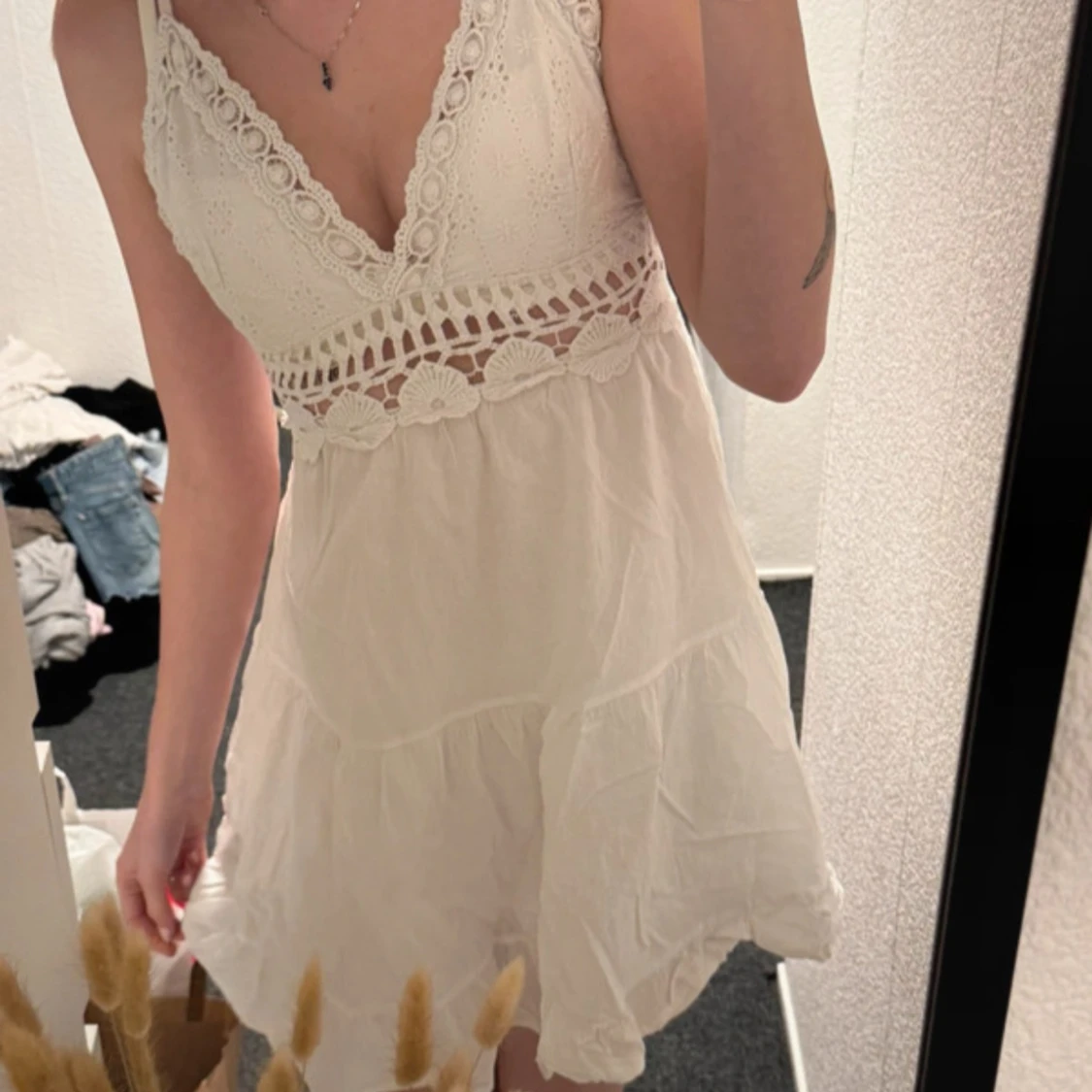 Säljer en söt vit klänning med spetsdetaljer upptill, v-ringning och dekorativt hålmönster under bysten. Klänningen har smala axelband, öppen rygg med knyt och volangig kjol. Perfekt för varma dagar!