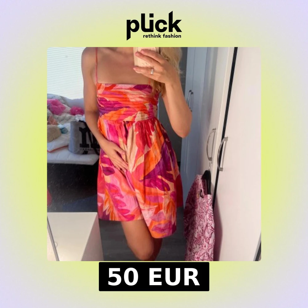 Supersöt kort sommarklänning med tunna axelband och färgstarkt blommigt mönster i rosa, orange, röd och beige toner. Klänningen har en smickrande passform med rynkad överdel och luftig kjol, perfekt för soliga dagar. Materialet känns lätt och bekvämt mot huden. Perfekt skick!