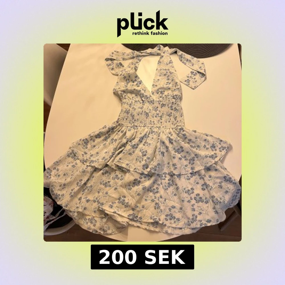 Supersöt kortklänning med blå blommor på vit botten, omlott över bysten och knyt i nacken. Smockad midja och volangig kjol ger en romantisk vibe. Perfekt för varma dagar och sommarhäng. aldrig använd