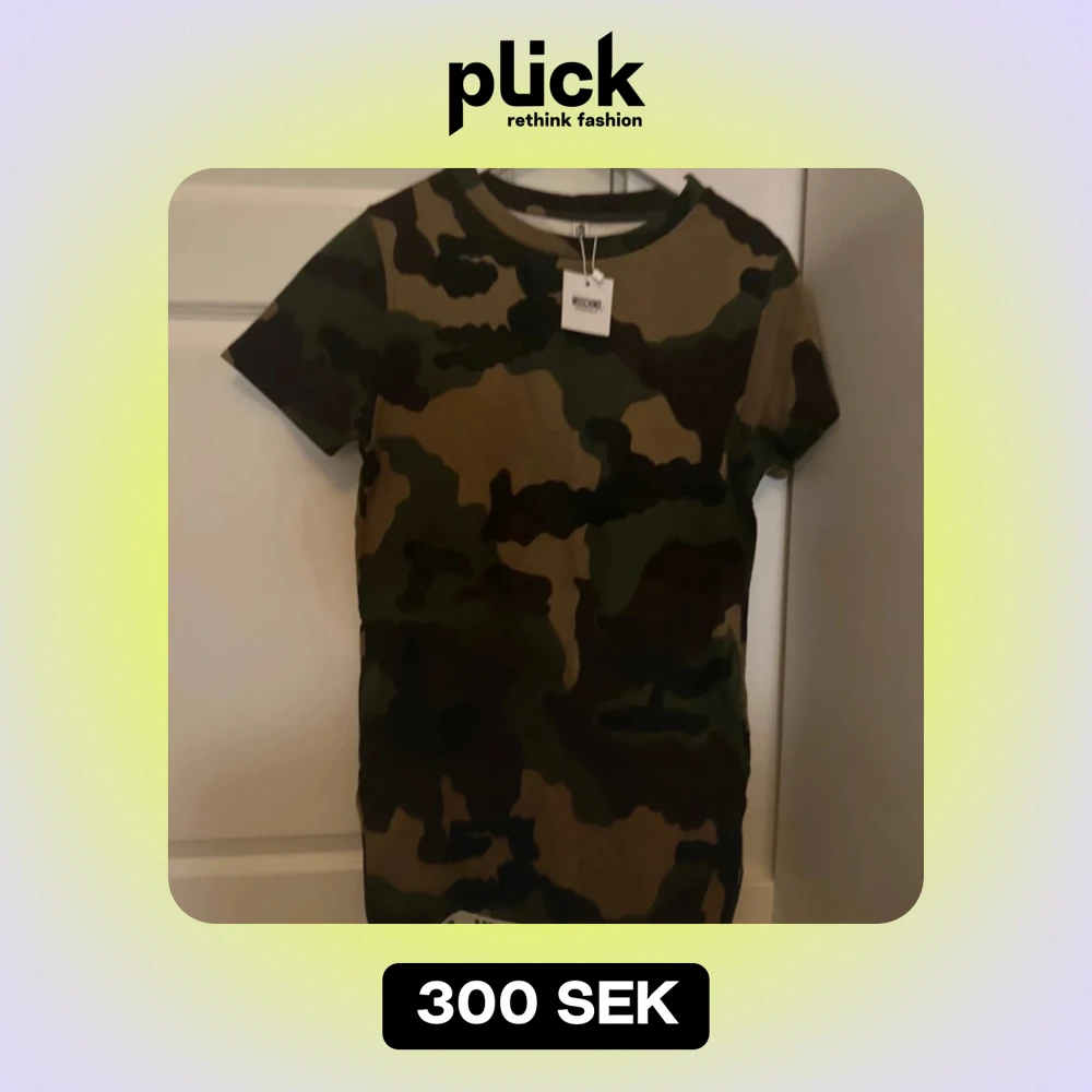 Säljer en supercool camouflage klänning från Moschino i storlek XS. Den är kortärmad och perfekt för en avslappnad stil. Materialet känns skönt mot huden och den har en klassisk rund hals. Perfekt för dig som vill sticka ut lite extra!
