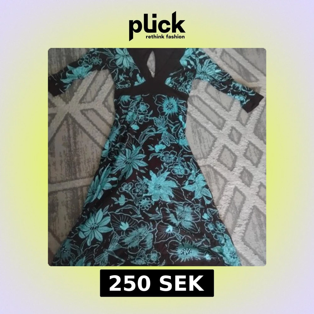 Snygg långklänning från Jane Norman med svart botten och turkost blommönster. Klänningen har v-ringad hals, trekvartsärm och ett band i midjan för att knyta. Materialet är mjukt och följsamt, perfekt för dig som gillar färgstarka prints och skön passform.