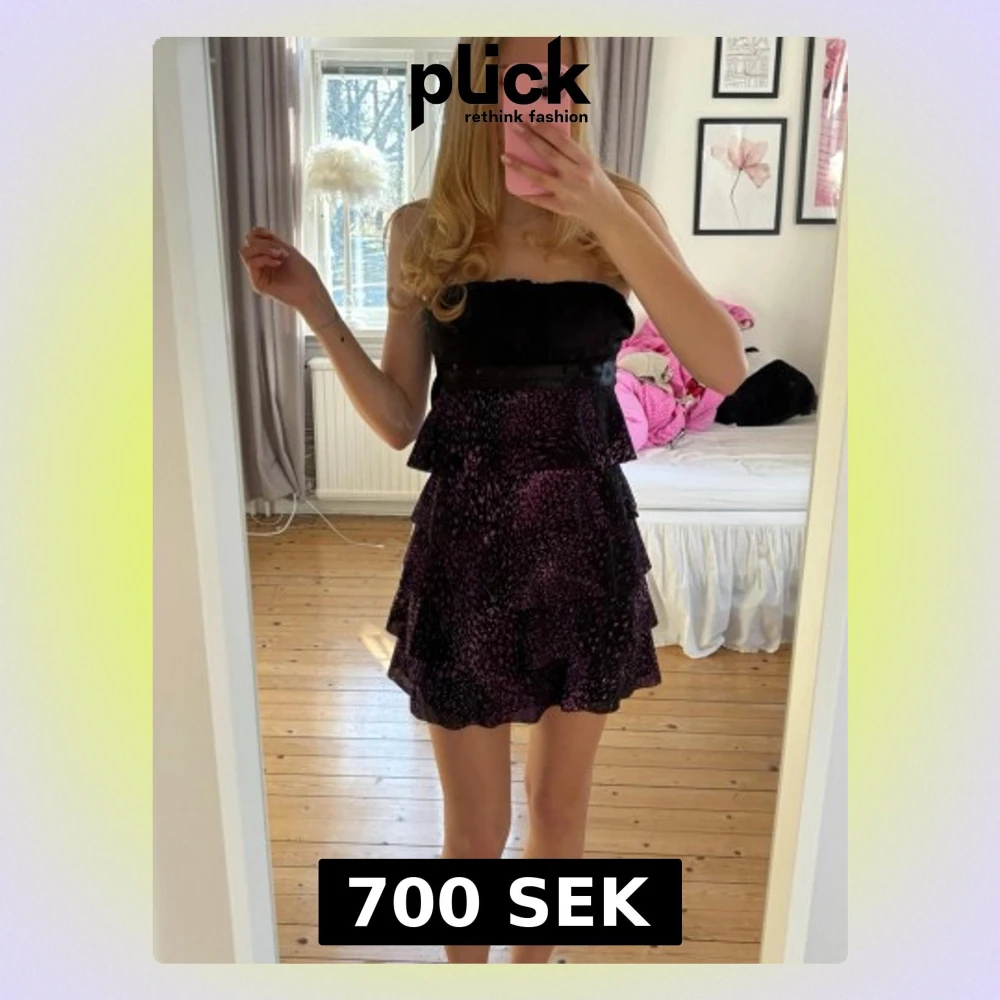 Säljer en kort axelbandslös klänning i svart och lila med volangdetaljer och glitter. Från Jane Norman, skulle säga storlek xs. Jättefint skick!💕