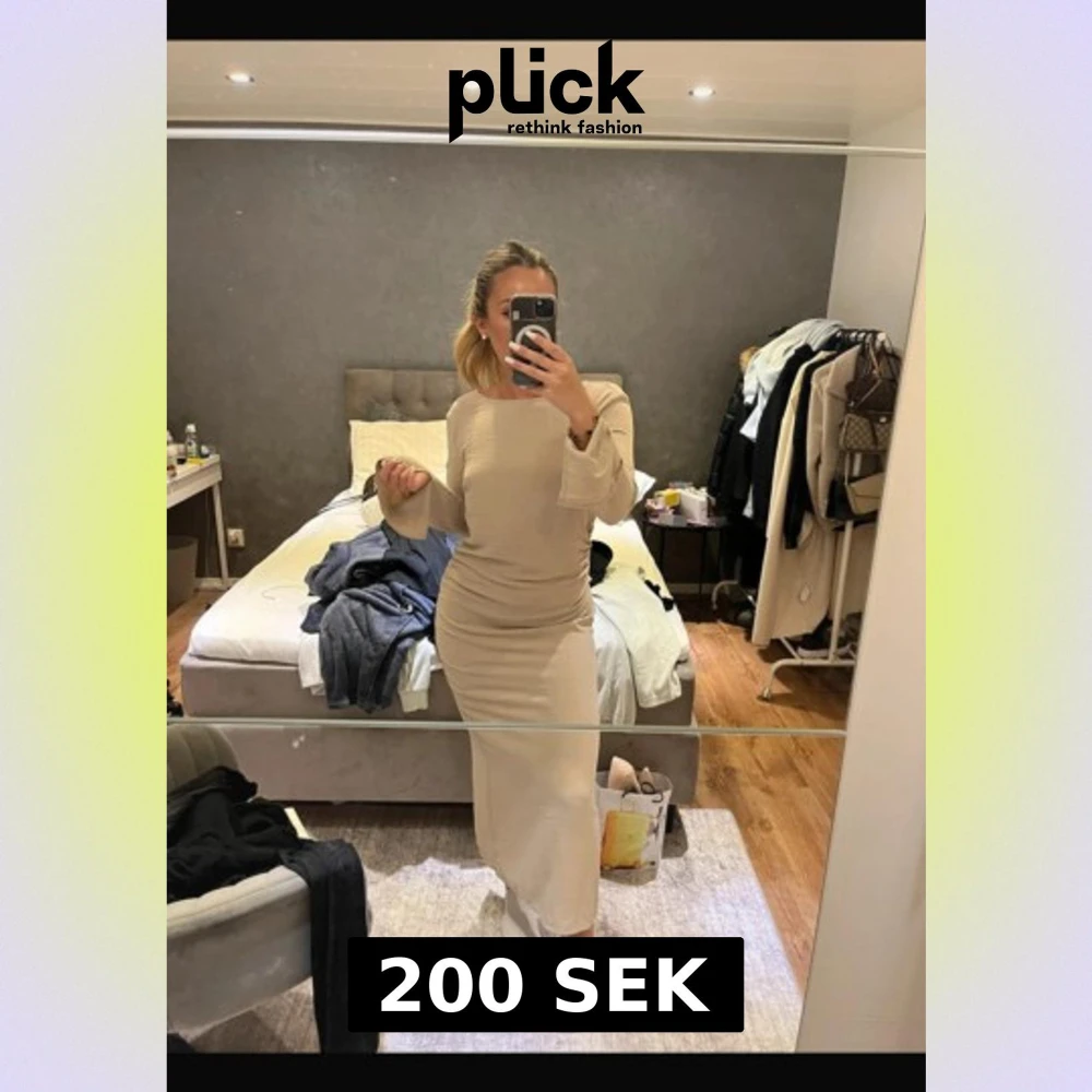 Säljer en beige långklänning med lång ärm och snygg öppen rygg. Aldrig använd, storlek xs