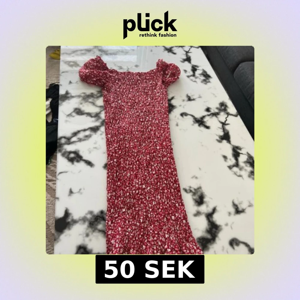 Säljer en röd långklänning med små vita blommor och puffärmar. Klänningen har en smockad, figurnära passform och offshoulder-design som ger en trendig vibe. Perfekt för dig som gillar romantiska detaljer och vill sticka ut med färg och mönster.