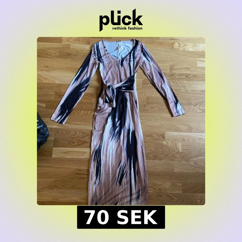 Långklänning i beige/rosa och svart med abstrakt mönster. Klänningen har lång ärm, rund halsringning och ett snyggt knyt i midjan. Materialet är mjukt och följsamt, perfekt för dig som gillar en unik look med coola detaljer. Använd en gång!