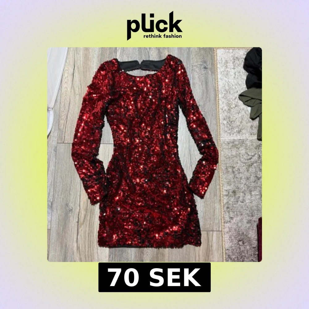 Säljer en kort röd klänning täckt av glittriga paljetter. Klänningen har lång ärm, markerad midja och en snygg öppen rygg med knäppning i nacken. Perfekt för dig som vill sticka ut och glänsa. Svart innerfoder för extra komfort. ‼️‼️‼️ en av de fästena i nacken är borta, se bild