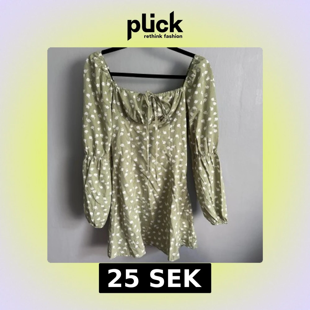 Supersöt ljusgrön kortklänning med vita blommor, långa puffärmar och söt knytning vid bysten. Klänningen har en avslappnad passform och är perfekt för vår och sommar. Materialet känns lätt och luftigt, och den blommiga looken ger en romantisk vibe.