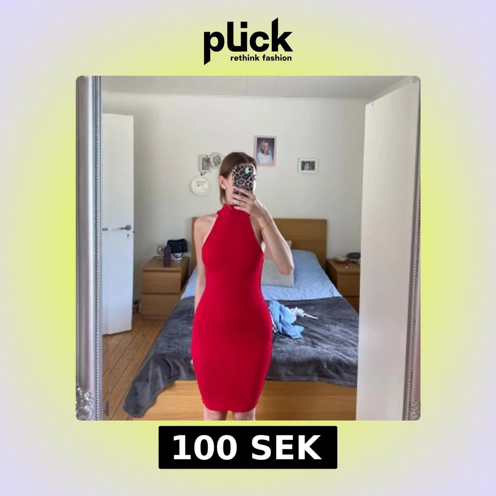 Säljer en tight, ärmlös röd klänning med hög krage och ribbad struktur. Klänningen är kort och har en figurnära passform som framhäver siluetten. Perfekt för dig som vill sticka ut med en enkel men snygg look.
