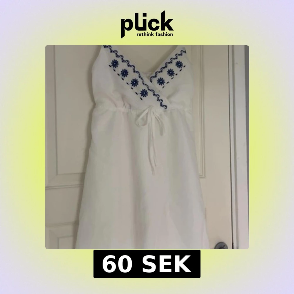 Söt vit kortklänning med blå broderade blommor. V-ringad framtill och smock där bak för bekväm pass form. Liten fläck där bak med men inget man tänker på och går säkert lätt bort💕 Nästintill helt oanvänd utöver provning!!🙌🏼