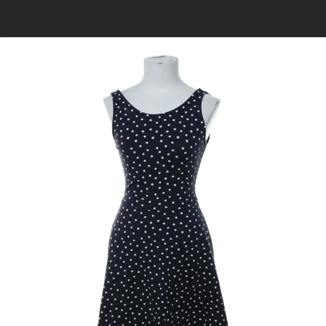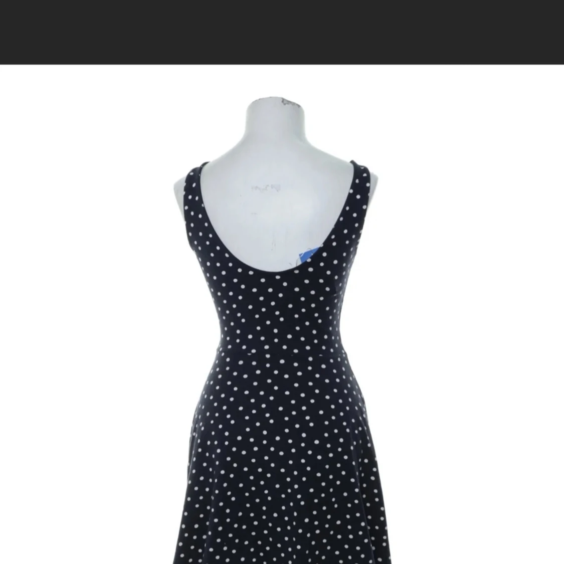 Snygg marinblå klänning med vita prickar och ärmlös design. Klänningen har rundad halsringning fram och djupare rygg, vilket ger en cool och feminin siluett. Passformen är normal och tyget känns mjukt och följsamt, perfekt för dig som gillar retrovibbar och stilren look.