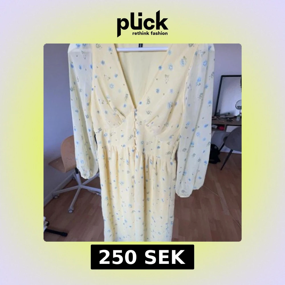Söt gul långklänning med små blå blommor och v-ringning. Klänningen har långa, transparenta ärmar och dekorativa tygklädda knappar framtill. Perfekt för vår och sommar. Den har brustit lite i en sömn (se sista bilden) men inget som syns!