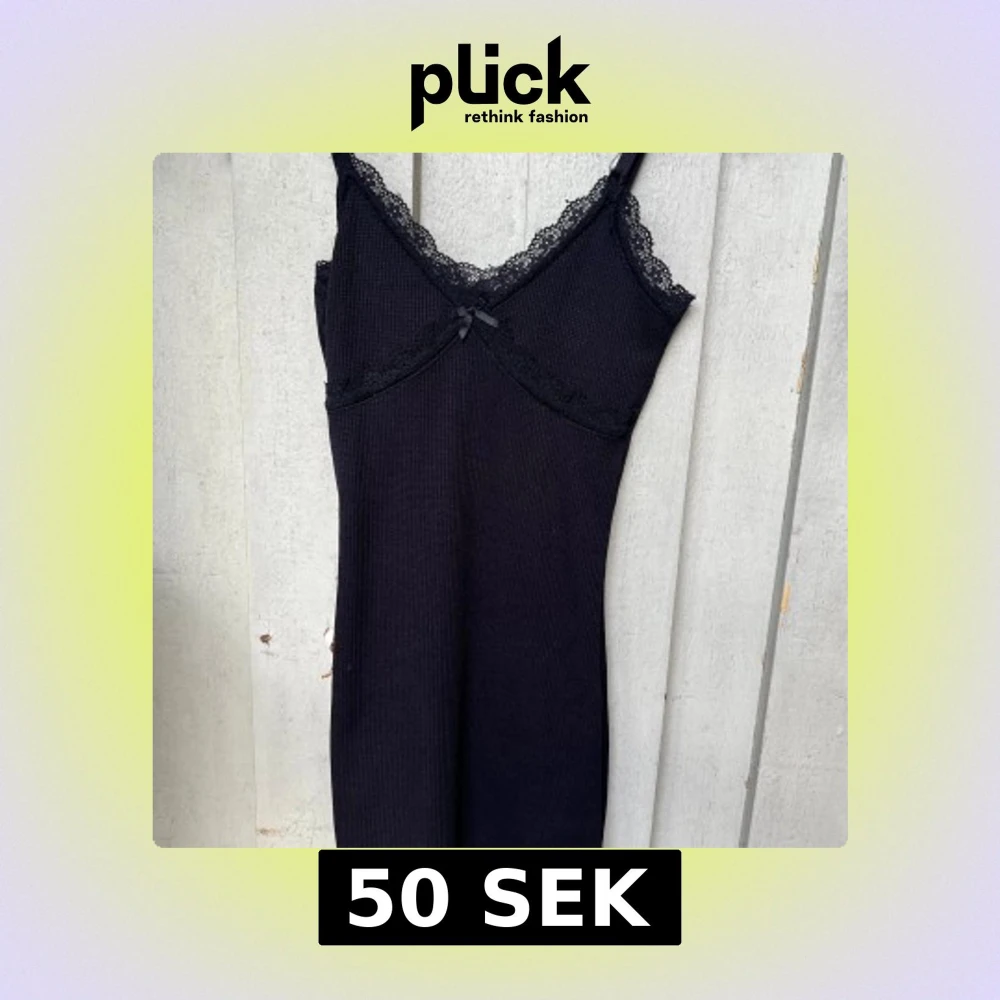 Supersöt svart kortklänning från H&M Divided i ribbad bomull med spetsdetaljer vid halsringningen och en liten rosett framtill. Axelbandslös design som ger en snygg och enkel look, perfekt för dig som gillar stilrena vibes.