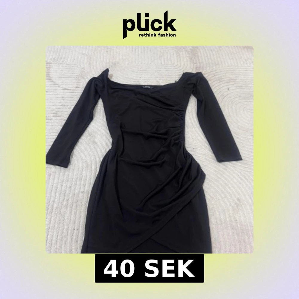 Svart figurnära klänning från SHEIN med omlottdesign och långa ärmar. Klänningen har en snygg offshoulder-ringning och lätt rynkade detaljer i sidan för en trendig look. Perfekt för dig som gillar stilrena och moderna plagg.