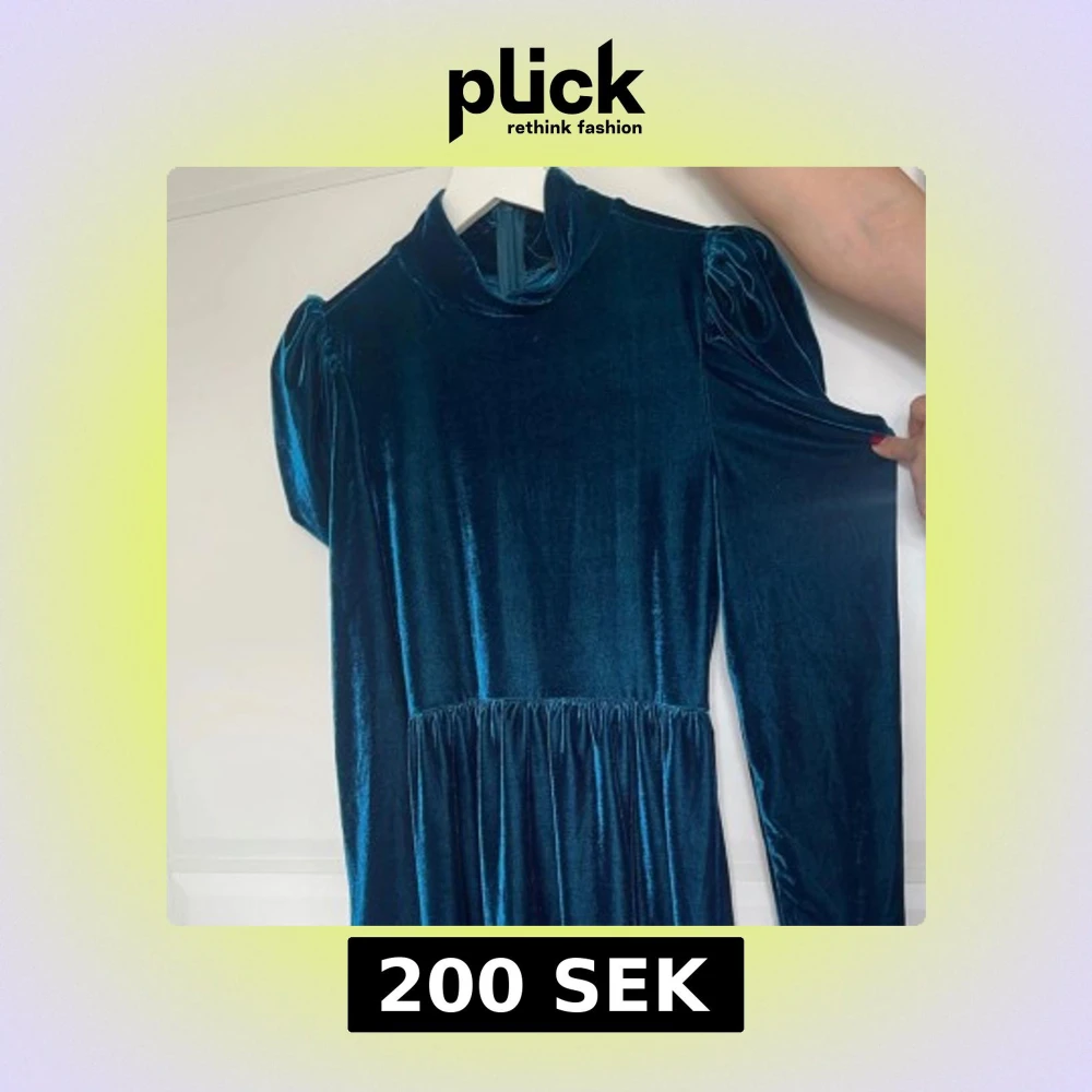 Supersnygg mörkblå sammetsklänning med puffiga axlar, lång ärm och hög krage. Klänningen har en markerad midja med rynk och ett mjukt, glansigt tyg som ger en lyxig känsla. Perfekt för dig som vill sticka ut med en cool och elegant look. Använd en gång!