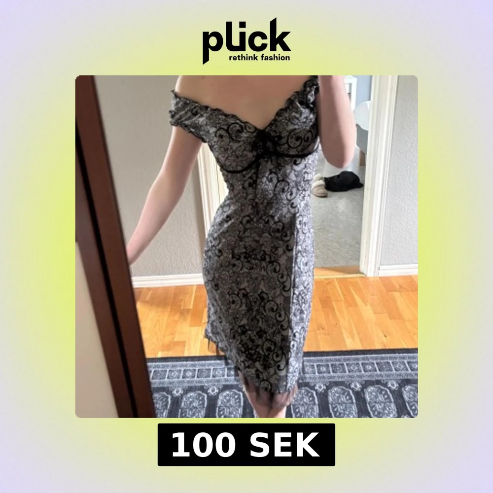 Säljer en elegant svart och vit klänning med spetsmönster och offshoulder-modell. Klänningen är figurnära och har fina detaljer längs urringningen. Perfekt för dig som vill sticka ut på festen!
