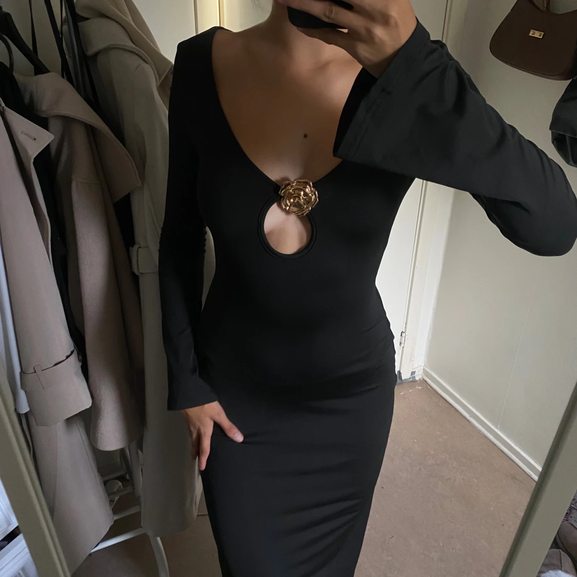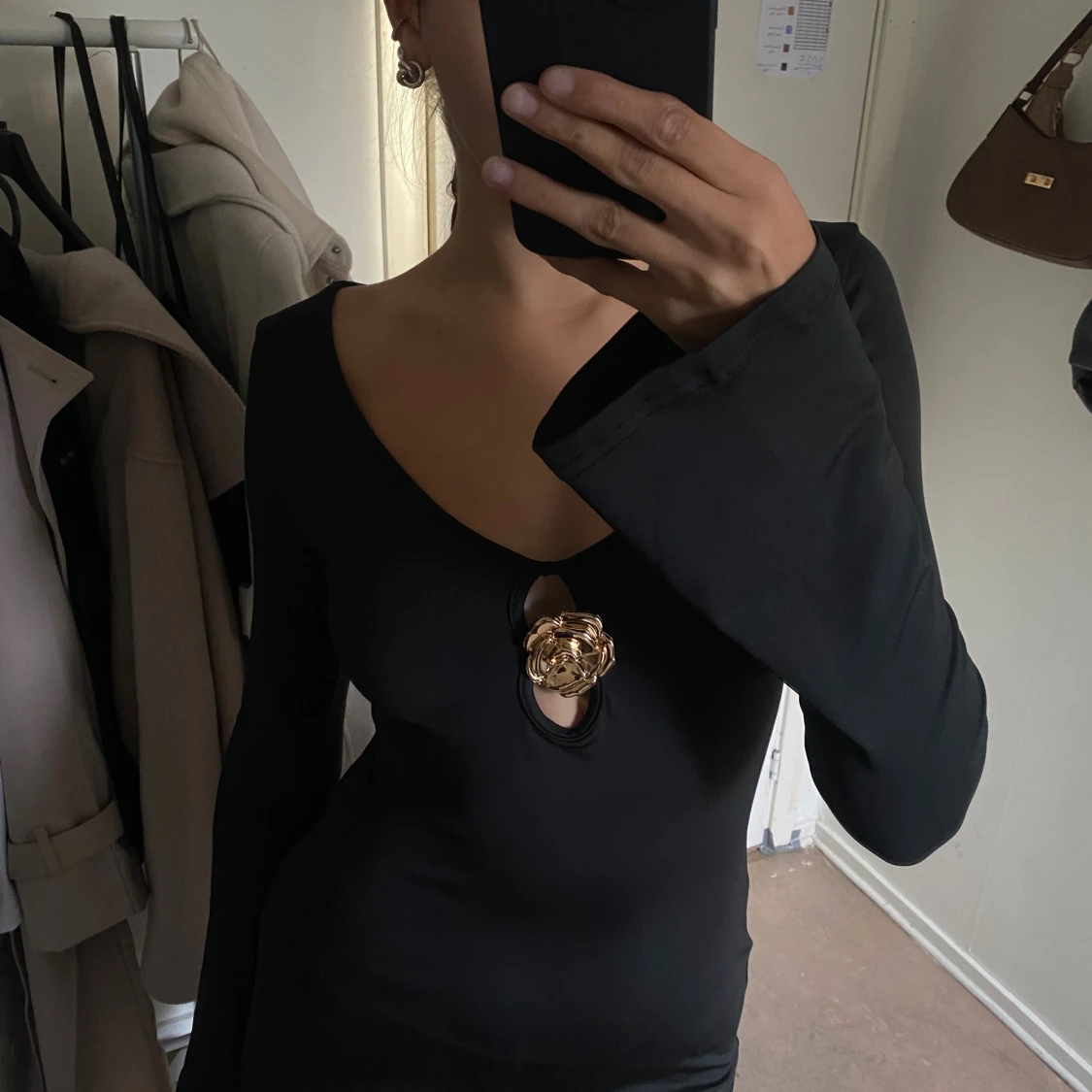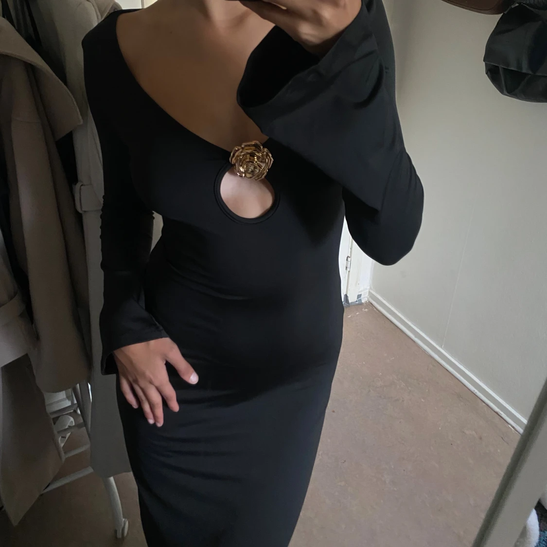 Supersnygg svart långklänning med djup v-ringning och lång ärm. Klänningen har en unik cut-out framtill med en guldig blomdetalj. . Materialet är stretchigt och sitter tight, med lätt utsvängda ärmslut. Aldrig använd!