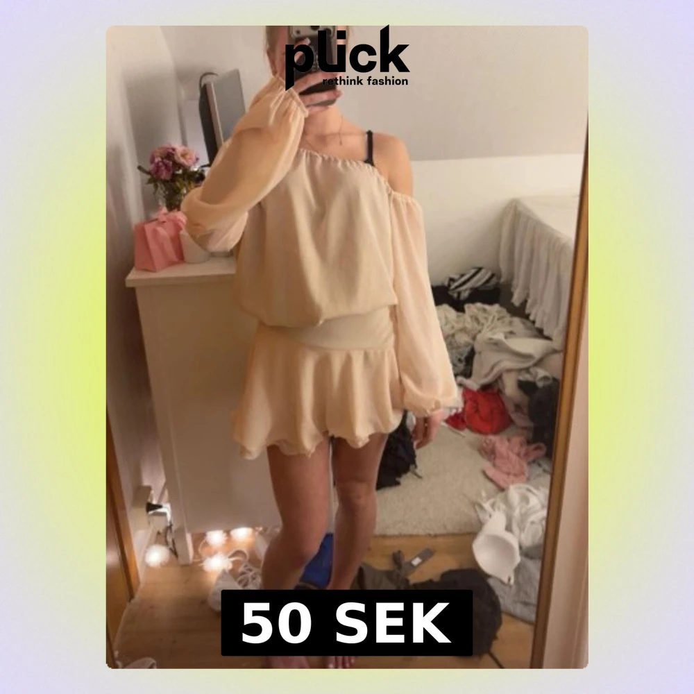 Söt ljus kortklänning med offshoulder-design och långa, luftiga ärmar. Kjolen har volangkant och klänningen har en avslappnad passform i midjan. Perfekt för sommarens varma dagar.
