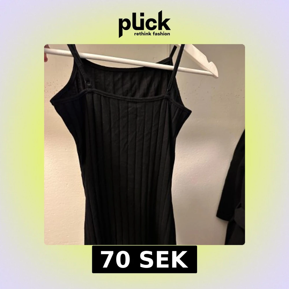 Snygg svart ribbad klänning med smala axelband och rynkdetalj framtill. Perfekt för en stilren look.
