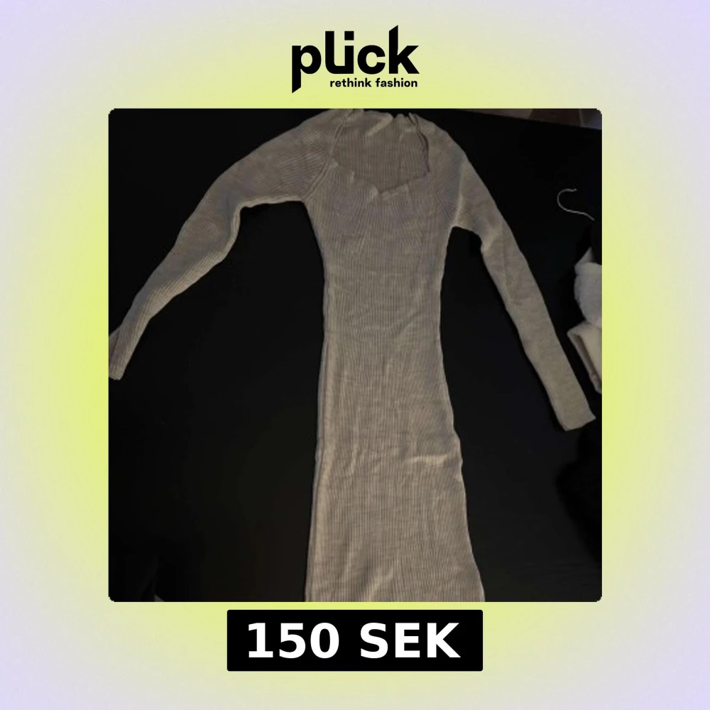 Snygg beige långklänning med ribbad struktur och lång ärm. Klänningen har en v-ringad hals och sitter tight mot kroppen för en smickrande siluett. Den har en slits där bak, säljer den då den är för liten och aldrig kommit till användning.