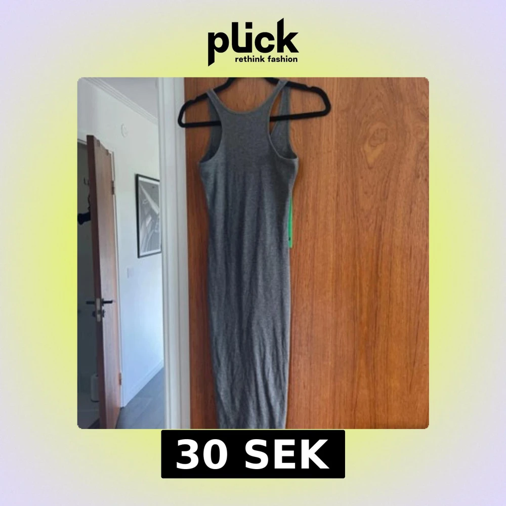 Grå ribbad klänning, vet ej storlek men strechig och passa nog XS-M. V-ringad rygg.