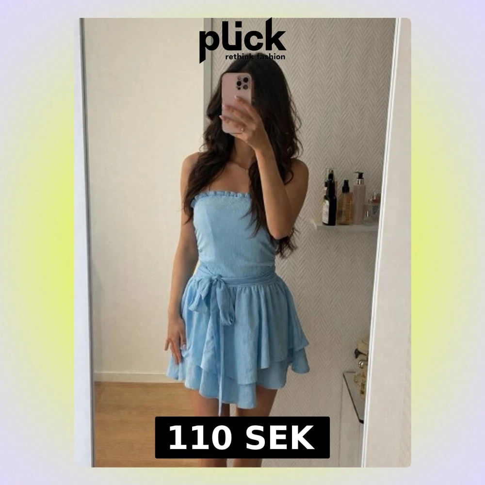Säljer en ljusblå axelbandslös klänning med smockad överdel och volangkjol i två lager. Klänningen har ett knytband i midjan och är gjord i ett lätt, luftigt tyg som ger en somrig känsla. Perfekt för dig som gillar en söt och enkel stil.