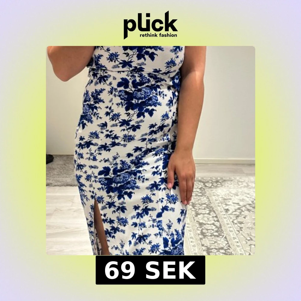 Säljer en vit klänning med blått blommönster och en snygg slits framtill. Klänningen har smala axelband och en draperad urringning. Perfekt för sommaren