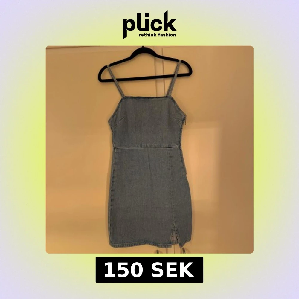 Säljer en snygg blå jeansklänning med smala axelband och rak halsringning. Klänningen är kort och har en liten slits framtill för extra detalj.