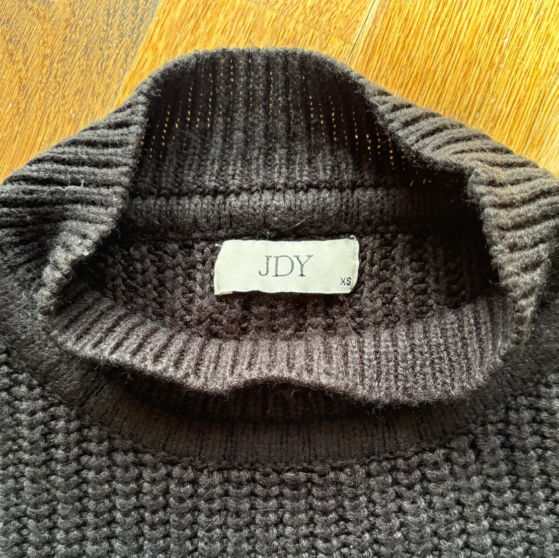 Mysig, fin svart stickad klänning från JDY i storlek XS. Klänningen har lång ärm, rundad hals och grovstickad struktur som ger en varm, stilren och enkel look. Jättefin att styla med boots, pumps eller sneakers! (Använd endast en gång).