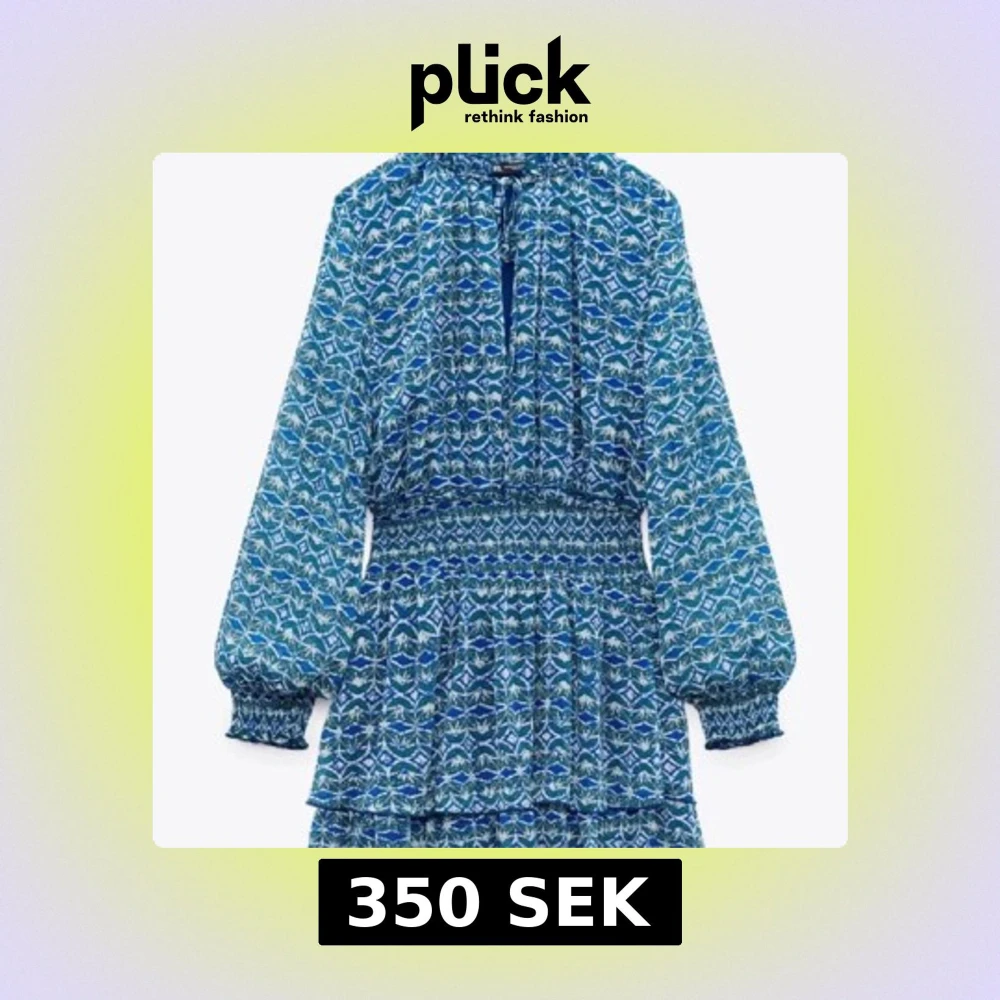 Snygg blå kortklänning med långärmade puffärmar och ett unikt geometriskt mönster i olika blå nyanser. Klänningen har volangdetaljer och smock i midjan för en skön passform. Perfekt för dig som gillar färg och mönster!