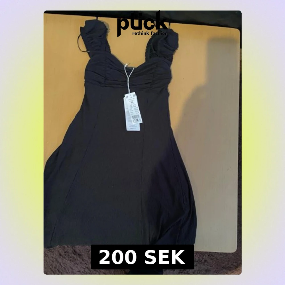 Snygg svart kort klänning med volangdetaljer vid axelbanden och rynkad byst. Klänningen har en feminin siluett och tunna axelband. Perfekt för dig som vill ha en enkel men elegant look.